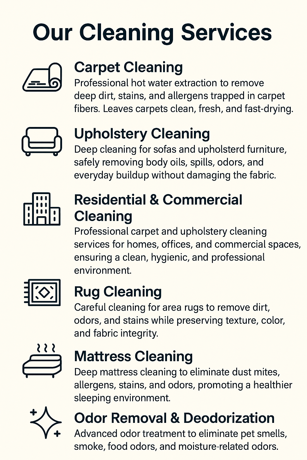 We focus exclusively on sofas, chairs, mattresses, carpets, rugs, and hard floors — delivering expert results with advanced equipment and quick-drying methods. Each service is designed to remove dust, stains, and allergens while protecting your furniture and flooring for long-lasting beauty.
